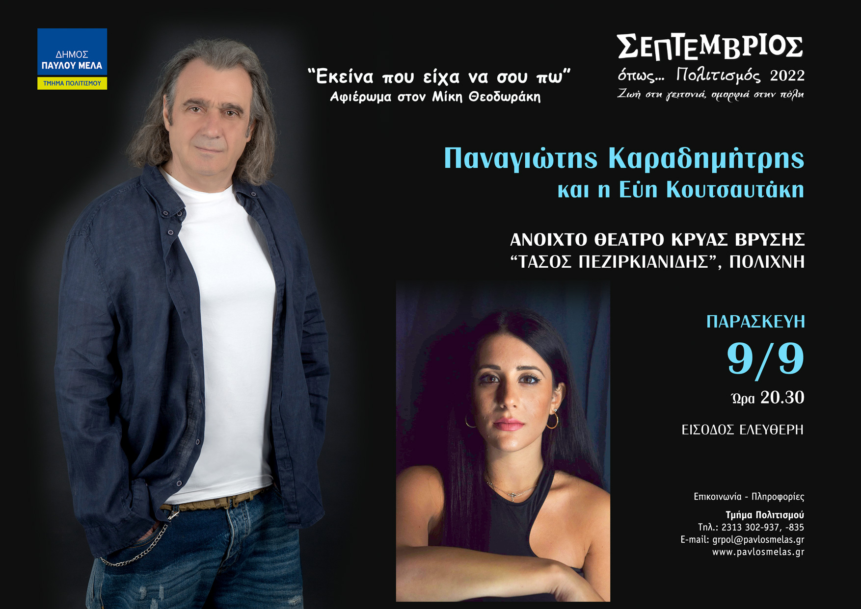 Την Παρασκευή 9 Σεπτεμβρίου θα πραγματοποιηθεί συναυλία η οποία είναι αφιερωμένη στην Μίκη Θεοδωράκη στις 20:30 στο θέατρο «Τάσος Πεζιρκιανίδης».