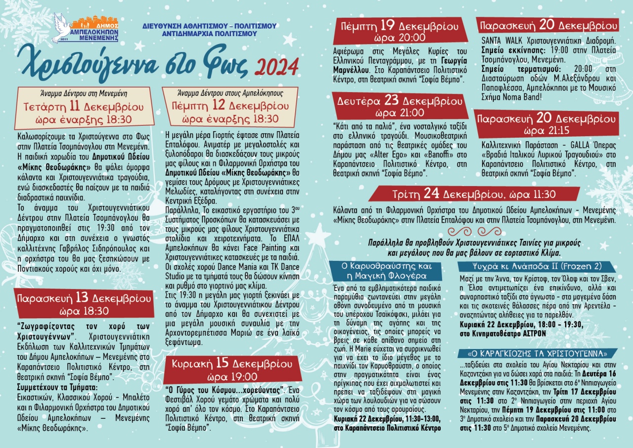 Με ένα πλούσιο πρόγραμμα για μικρούς και μεγάλους, θα γιορτάσει ο δήμος Αμπελοκήπων – Μενεμένης τα φετινά Χριστούγεννα.