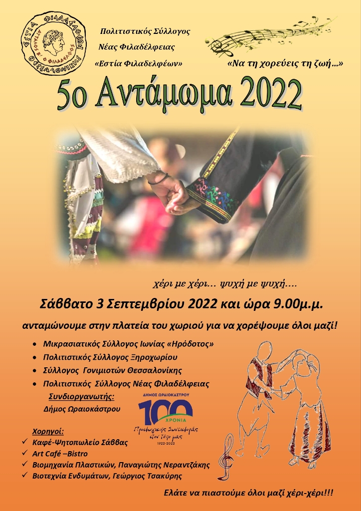 Το 5ο Αντάμωμα θα πραγματοποιηθεί το Σάββατο, 3 Σεπτεμβρίου 2022, στις 21.00, στην πλατεία της Νέας Φιλαδέλφειας.