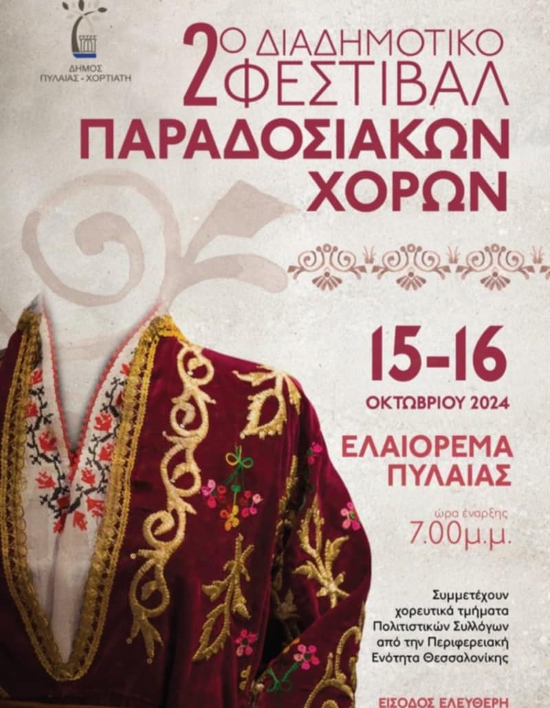 Μετά από την περσινή διοργάνωση, ο Δήμος Πυλαίας – Χορτιάτη διοργανώνει φέτος το 2ο Διαδημοτικό Φεστιβάλ Παραδοσιακών Χορών στις 15 & 16 Οκτωβρίου, με ώρα έναρξης την 7μ.μ.
