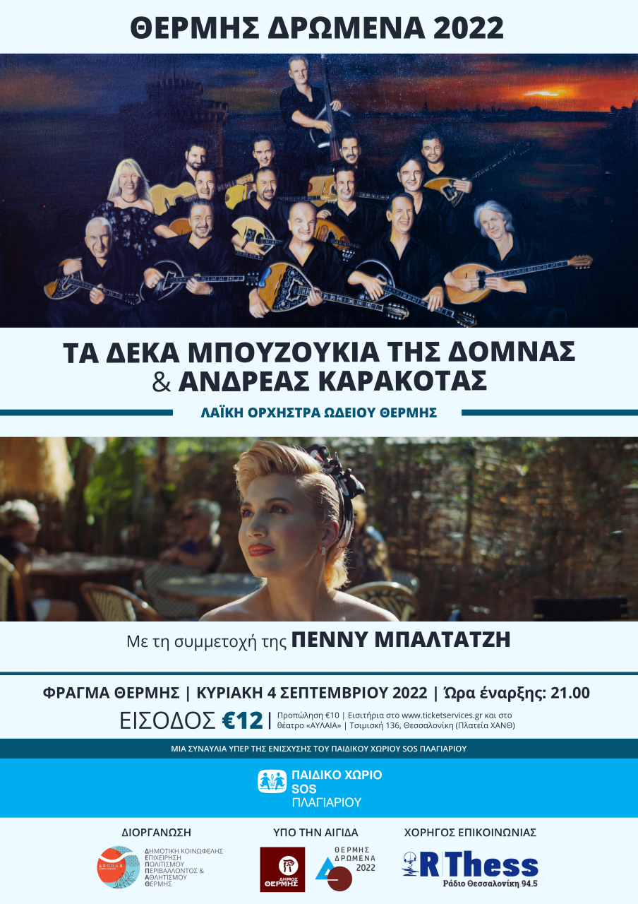 Θα συμμετάσχουν το μουσικό σχήμα «Δέκα Μπουζούκια της Δόμνας», μαζί με τον Ανδρέα Καρακότα, τη Λαϊκή Ορχήστρα Ωδείου Θέρμης και την αγαπημένη ερμηνεύτρια Πέννυ Μπαλτατζή.