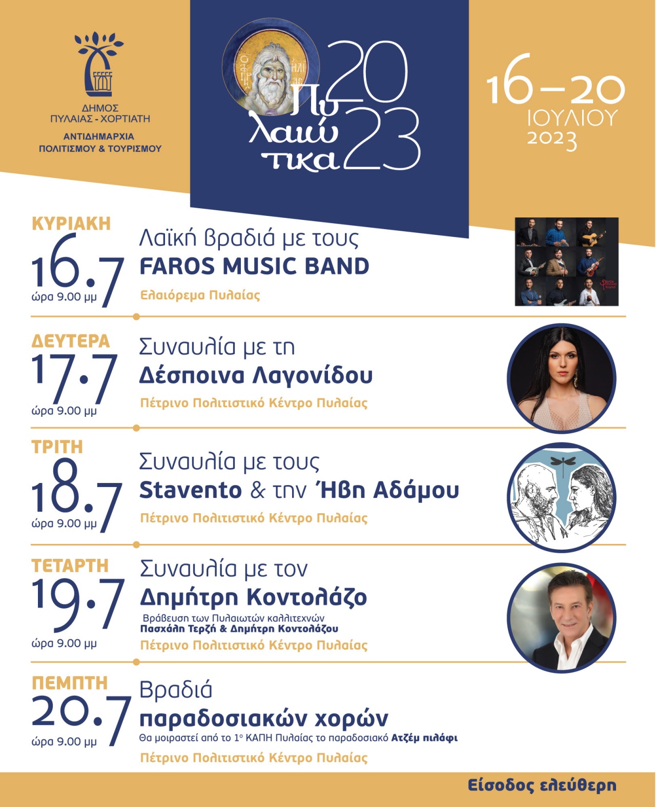 Τετάρτη 19 Ιουλίου Πέτρινο Πολιτιστικό Κέντρο. Συναυλία με τον Πυλαιώτη Δημήτρη Κοντολάζο, ο οποίος θα τραγουδήσει με την ορχήστρα του συνοδεία δύο ταλαντούχων τραγουδιστριών, της Μαρίας Ιακώβου και της Χριστίνας Ζώτου. Αξίζει να σημειωθεί ότι τα χρήματα της αμοιβής του κ. Κοντολάζου κατόπιν επιθυμίας του καλλιτέχνη θα δοθούν για φιλανθρωπικό σκοπό, στο Σωματείο Φίλων Παιδιών Αγ. Δημητρίου Κ.Ε.Π.Ε.Π και στην ΚΙΝΗΣΗ ΠΟΛΙΤΩΝ ΙΔΡΥΣΗΣ ΛΑΟΓΡΑΦΙΚΟΥ ΜΟΥΣΕΙΟΥ ΠΥΛΑΙΑΣ. Την ημέρα της κεντρικής συναυλίας θα τιμηθούν για την προσφορά τους στον καλλιτεχνικό χώρο, οι τραγουδιστές Δημήτρης Κοντολάζος και Πασχάλης Τερζής, οι οποίοι έλκουν την καταγωγή τους από την Πυλαία.