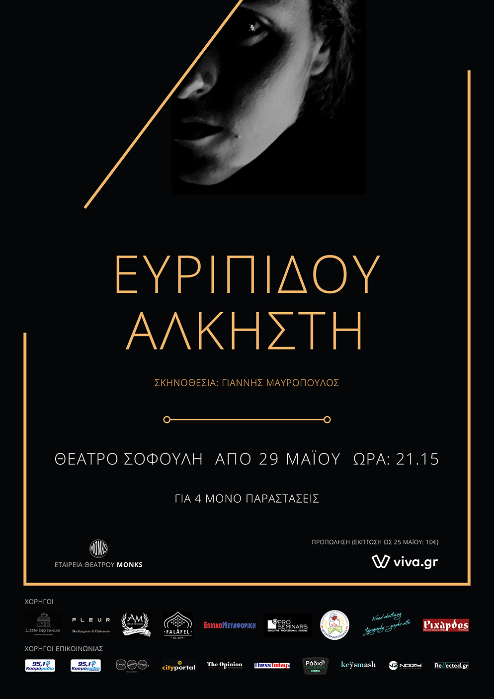 Εισιτήρια: 13 ευρώ, Μειωμένο: 10 ευρώ (ΑμεΑ, φοιτητικό, ανέργων). Προπώληση μέσω viva: https://www.viva.gr/tickets/theater/festival/eyripidou-alkisti-sofouli/ και κράτηση τηλεφωνικά στο 2310 423925. Έκπτωση προπώλησης/κράτησης έως 25/5: 10 ευρώ