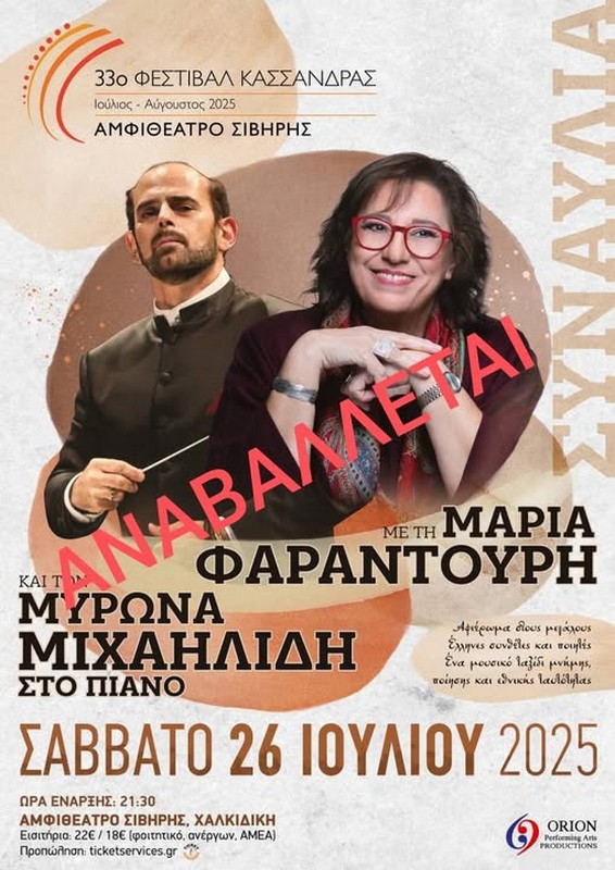 Αναβάλλεται η προγραμματισμένη συναυλία με τη Μαρία Φαραντούρη και τον Μύρωνα Μιχαηλίδη, η οποία ήταν προγραμματισμένη να πραγματοποιηθεί το Σάββατο 26 Ιουλίου στο Αμφιθέατρο Σίβηρης, στα πλαίσια του 13ου Φεστιβάλ Κασσάνδρας.