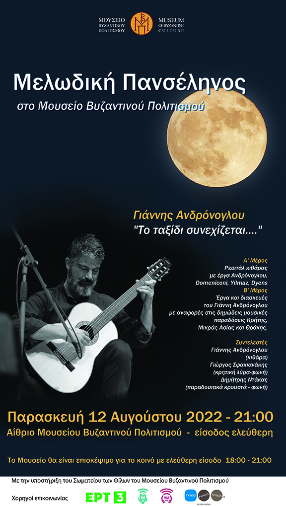 Την Παρασκευή 12 Αυγούστου στις 21:00, το ΜΒΠ θα παρουσιάσει στο αίθριό του μουσική εκδήλωση με τίτλο «Το ταξίδι συνεχίζεται….» – “Travelling goes on” με κύριο συντελεστή και συντονιστή τον μουσικό, καθηγητή και σολίστ κιθάρας Γιάννη Ανδρόνογλου.