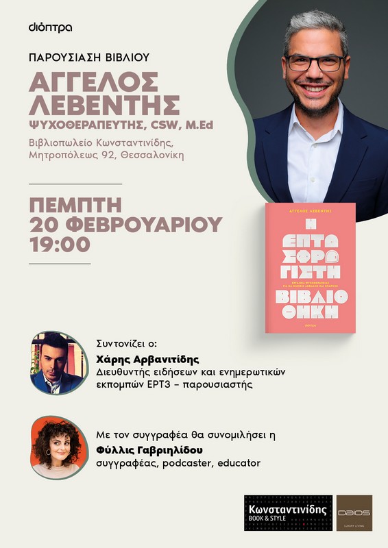 Παρουσιάζεται αύριο Πέμπτη 20 Φεβρουαρίου στο βιβλιοπωλείο Κωνσταντινίδης, στη Μητροπόλεως, το βιβλίο «Επτασφράγιστη Βιβλιοθήκη» του ψυχοθεραπευτή Άγγελου Λεβέντη από τις εκδόσεις Διόπτρα.