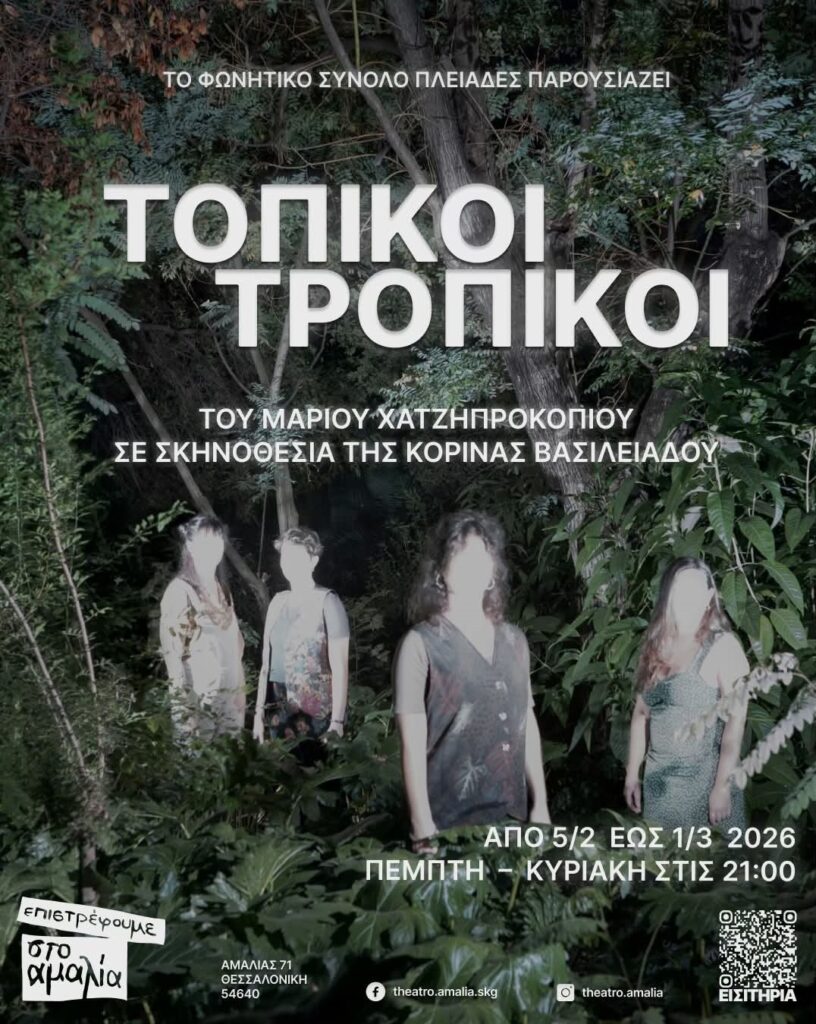 «ΤΟΠΙΚΟΙ ΤΡΟΠΙΚΟΙ» του φωνητικού συνόλου Πλειάδες | Κείμενο: Μάριος Χατζηπροκοπίου | Σκηνοθεσία, Δραματουργία & Επιμέλεια σκηνικού χώρου: Κορίνα Βασιλειάδου | 12 έως 15 Φεβρουαρίου