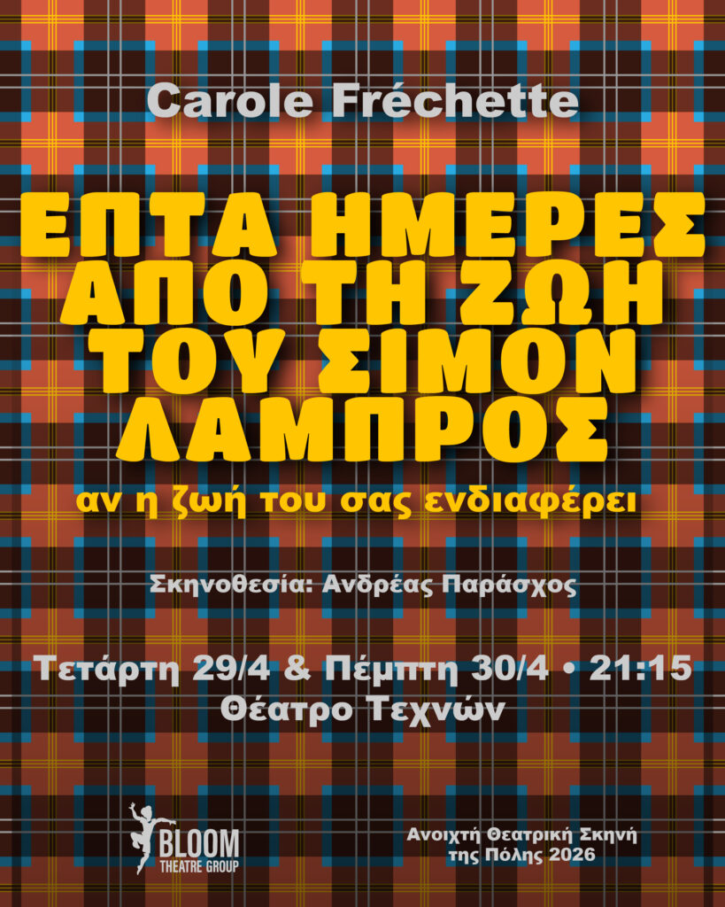 «ΕΠΤΑ ΗΜΕΡΕΣ ΑΠΟ ΤΗ ΖΩΗ ΤΟΥ ΣΙΜΟΝ ΛΑΜΠΡΟΣ – ΑΝ Η ΖΩΗ ΤΟΥ ΣΑΣ ΕΝΔΙΑΦΕΡΕΙ» της Carole Fréchette, στο πλαίσιο της Ανοιχτής Θεατρικής Σκηνής της Πόλης 2026 | Μετάφραση: Ξανθίππη Κουτούφη | Σκηνοθεσία: Ανδρέας Παράσχος | 29 & 30 Απριλίου