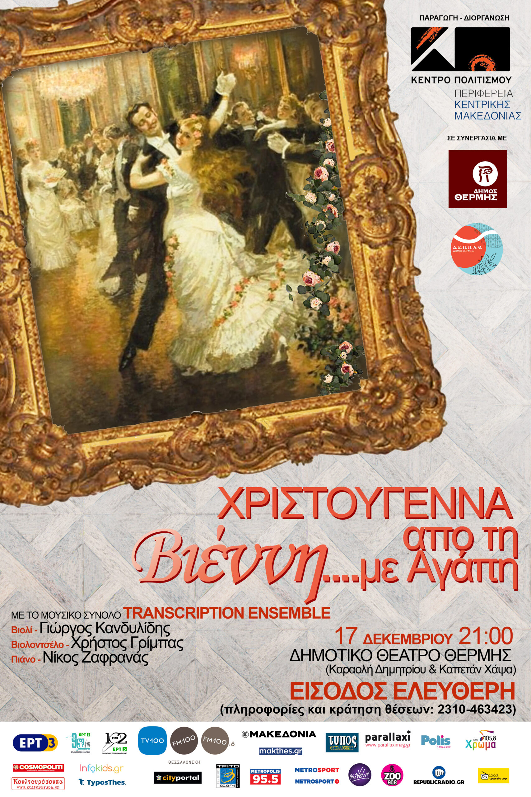 Την εορταστική συναυλία «Χριστούγεννα από τη Βιέννη…με αγάπη» με το μουσικό σχήμα Transcription Ensemble παρουσιάζει το Κέντρο Πολιτισμού Περιφέρειας Κεντρικής Μακεδονίας σε συνεργασία με τον Δήμο Θέρμης και την Δημοτική Κοινωφελή Επιχείρηση Πολιτισμού , Περιβάλλοντος & Αθλητισμού Θέρμης (Δ.Ε.Π.Π.Α.Θ).