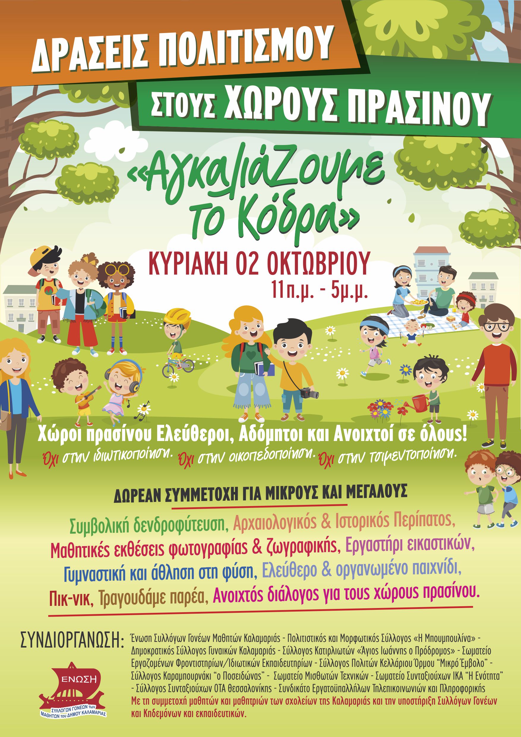 Η εκδήλωση αποτελεί την 3η Δράση Πολιτισμού σε χώρους πρασίνου, με βάση το κοινό πλαίσιο που έχουμε συνυπογράψει με τους ακόλουθους φορείς και συνδιοργανωτές της εκδήλωσης, ενάντια στα σχέδια εμπορευματοποίησης και οικοπεδοποίησης των ελεύθερων χώρων της Καλαμαριάς: Πολιτιστικός και Μορφωτικός Σύλλογος «Η Μπουμπουλίνα» – Δημοκρατικός Σύλλογος Γυναικών Καλαμαριάς – Σύλλογος Κατιρλιωτών «Άγιος Ιωάννης ο Πρόδρομος» – Σωματείο Εργαζομένων Φροντιστηρίων/Ιδιωτικών Εκπαιδευτηρίων – Σύλλογος Πολιτών Κελλάριου Όρμου “Μικρό Έμβολο” – Σύλλογος Καραμπουρνάκι “o Ποσειδώνας” – Σωματείο Μισθωτών Τεχνικών – Σωματείο Συνταξιούχων ΙΚΑ “Η Ενότητα” – Σύλλογος Συνταξιούχων ΟΤΑ Θεσσαλονίκης – Συνδικάτο Εργατοϋπαλλήλων Τηλεπικοινωνιών και Πληροφορικής.