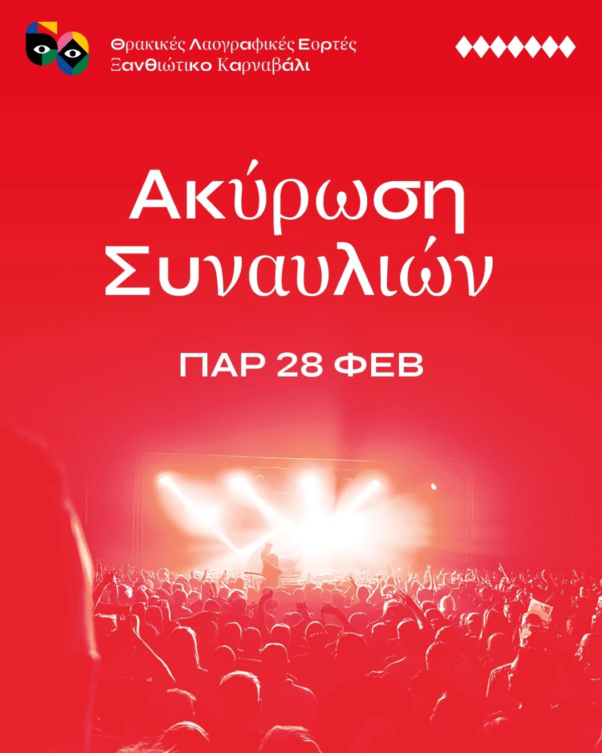 Όπως ενημερώνει ο Δήμος Ξάνθης, η απόφαση αυτή ελήφθη με τη σύμφωνη γνώμη των καλλιτεχνών, ως ένδειξη σεβασμού στην ημέρα μνήμης των ανθρώπων που χάθηκαν στην τραγωδία των Τεμπών.