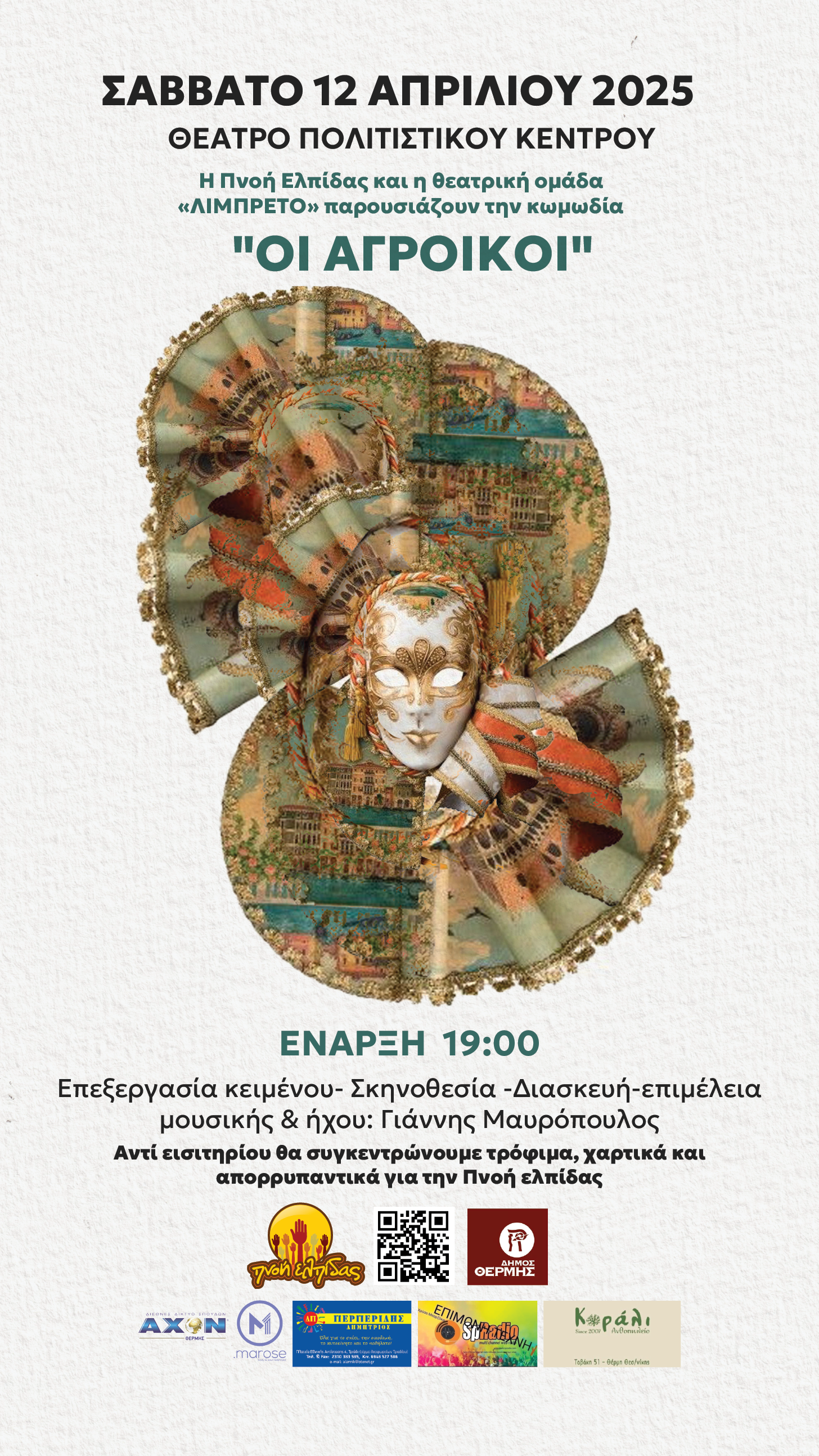 Η εθελοντική φιλανθρωπική εταιρεία Πνοή Ελπίδας και η θεατρική ομάδα «Λιμπρέτο» παρουσιάζουν την κωμωδία «Οι Αγροίκοι», το Σάββατο 12 Απριλίου 2025, στο Θέατρο του Πολιτιστικού Κέντρου του Δήμου Θέρμης.