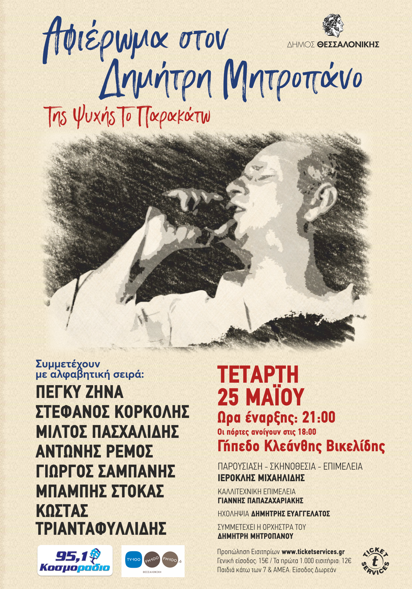 10 χρόνια χωρίς τον Δημήτρη Μητροπάνο. Ο Δήμος Θεσσαλονίκης διοργανώνει μια μεγάλη συναυλία-αφιέρωμα στον αξέχαστο λαϊκό ερμηνευτή.