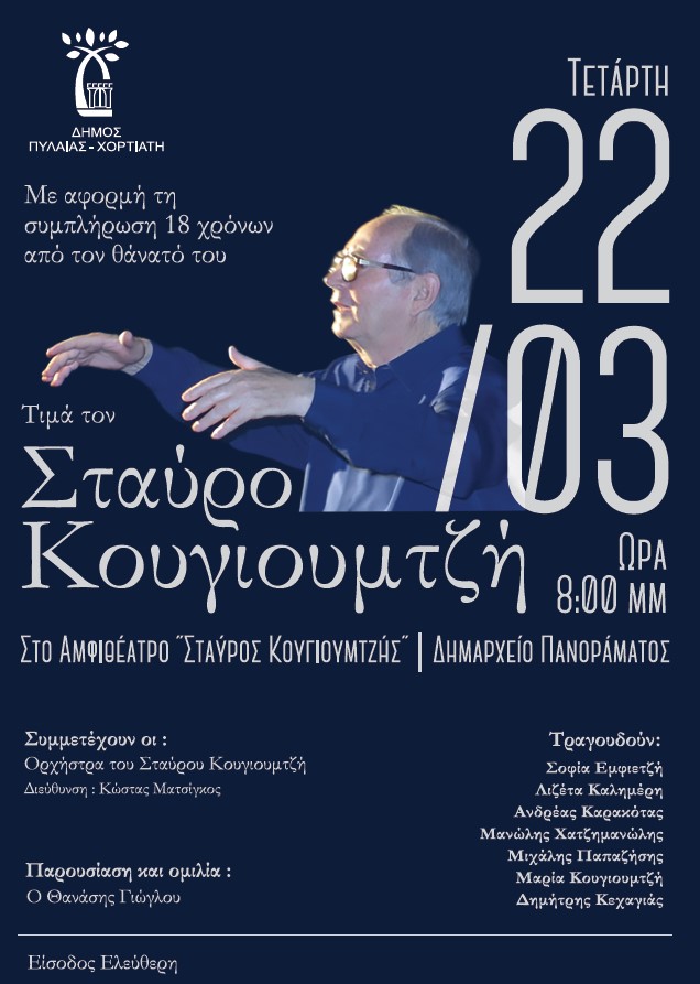 Μια μοναδική μουσική εκδήλωση αφιέρωμα στον Σταύρο Κουγιουμτζή, με αφορμή τη συμπλήρωση 18 χρόνων από τον θάνατό του, διοργανώνει ο δήμος Πυλαίας-Χορτιάτη στο Πανόραμα.