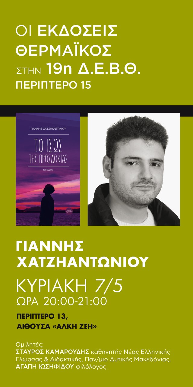 Ο Γιάννης Χατζηαντωνίου παρουσιάζει το βιβλίο του «Το ίσως της προσδοκίας» από τις εκδόσεις ΘΕΡΜΑΪΚΟΣ, την Κυριακή 7 Μαΐου, 20:00-21:00, Αίθουσα «Άλκη Ζέη» – Περίπτερο 13.