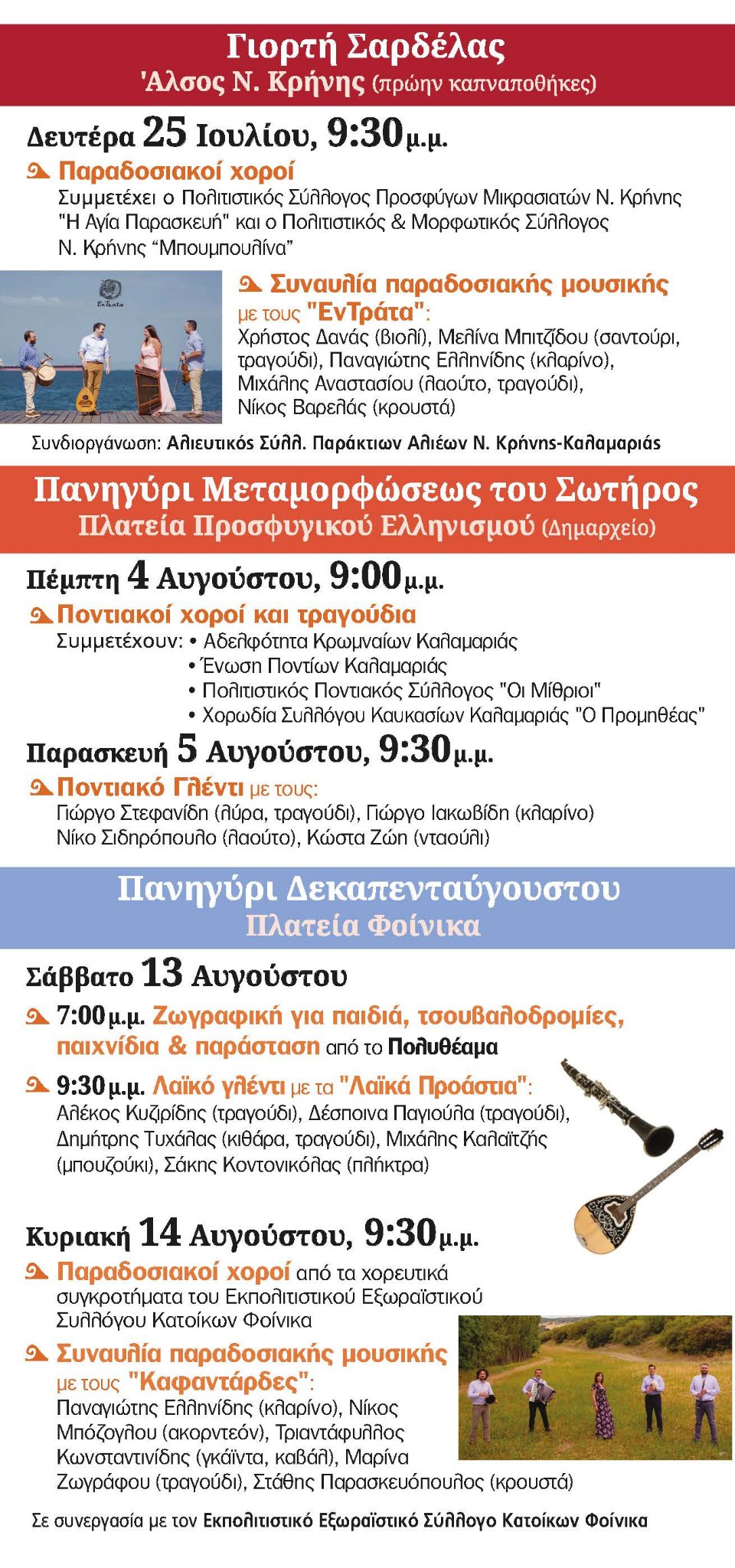 Παραδοσιακοί χοροί, στους οποίους συμμετέχουν ο Πολιτιστικός Σύλλογος Προσφύγων Μικρασιατών Νέας Κρήνης ” Η Αγία Παρασκευή” και ο Πολιτιστικός Σύλλογος Νέας Κρήνης “Μπουμπουλίνα” θα διασκεδάσουν τους; κατοίκους και τους επισκέπτες της γιορτής σαρδέλας.