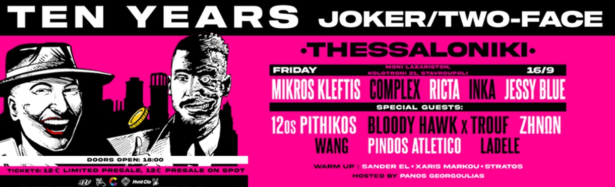 Οι Joker/Two-Face, ένα από τα σημαντικότερα ονόματα του σύγχρονου ραπ στερεώματος φέτος γιορτάζουν 10 χρόνια ύπαρξης και δημιουργίας, παρέα με φίλους και συνεργάτες από όλη τους την πορεία.