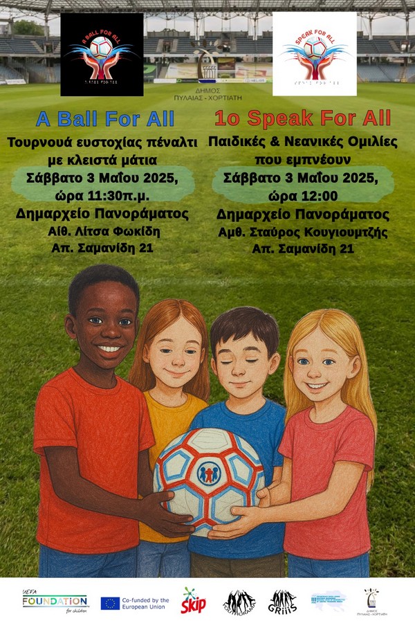 Ο Δήμος Πυλαίας Χορτιάτη, η Περιφερειακή Ένωση Δήμων Κεντρικής Μακεδονίας και το Όραμα Νέων Youthorama διοργανώνουν το 1ο «Speak for all» στο Πολιτιστικό Κέντρο Πανοράματος του Δήμου Πυλαίας-Χορτιάτη. Η πρώτη μαζική δράση του φορέα για το 2025 θα υλοποιηθεί το Σάββατο 3 Μαΐου στις 12:00 στο Πολιτιστικό Κέντρο Πανοράματος.