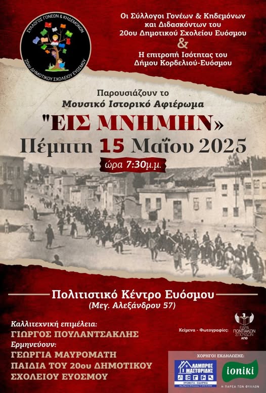 Ο Σύλλογος Γονέων και Κηδεμόνων του 20ου Δημοτικού Σχολείου Ευόσμου στην προσπάθεια του να διατηρήσει ζωντανή την ιστορική μνήμη στα παιδιά και όχι μόνο, σε συνεργασία με τον Σύλλογο Διδασκόντων και την επιτροπή Ισότητας του Δήμου Κορδελιού-Ευόσμου, διοργανώνουν μια εκδήλωση μνήμης για τη γενοκτονία των Ελλήνων του Πόντου.