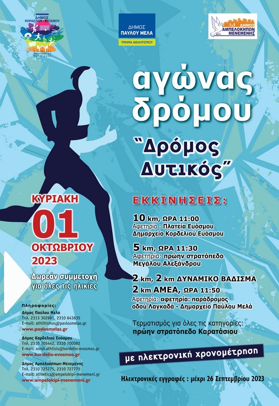 Ο Πρόεδρος της Κεντρικής Ένωσης Δήμων Ελλάδος και Δήμαρχος Αμπελοκήπων -Μενεμένης Λάζαρος Κυρίζογλου, ο Δήμαρχος Κορδελιού – Ευόσμου Κλεάνθης Μανδαλιανός, και ο Δήμαρχος Παύλου Μελά Δημήτρης Δεμουρτζίδης προσκαλούν τον κόσμο την Κυριακή 1 Οκτωβρίου 2023 να παρευρεθεί στον αγώνα δρόμου με την επωνυμία “Δρόμος Δυτικός” που διοργανώνουν το Τμήμα Αθλητισμού του Δήμου Παύλου Μελά, το Τμήμα Διαχείρισης Αθλητικών Χώρων του Δήμου Κορδελιού – Ευόσμου και το Γραφείο Αθλητισμού και Νέας Γενιάς του Δήμου Αμπελοκήπων Μενεμένης, με αφετηρίες για τα 10 km την πλατεία Ευόσμου στις 11:00, για τα 5 km το πρώην στρατόπεδο Μεγάλου Αλεξάνδρου στις 11:30, και για τα 2 km τον παράδρομο της οδού Λαγκαδά, στο ύψος του Δημαρχείου Παύλου Μελά στις 11:50, με κοινό τερματισμό όλων των διαδρομών, το πρώην στρατόπεδο Καρατάσιου.