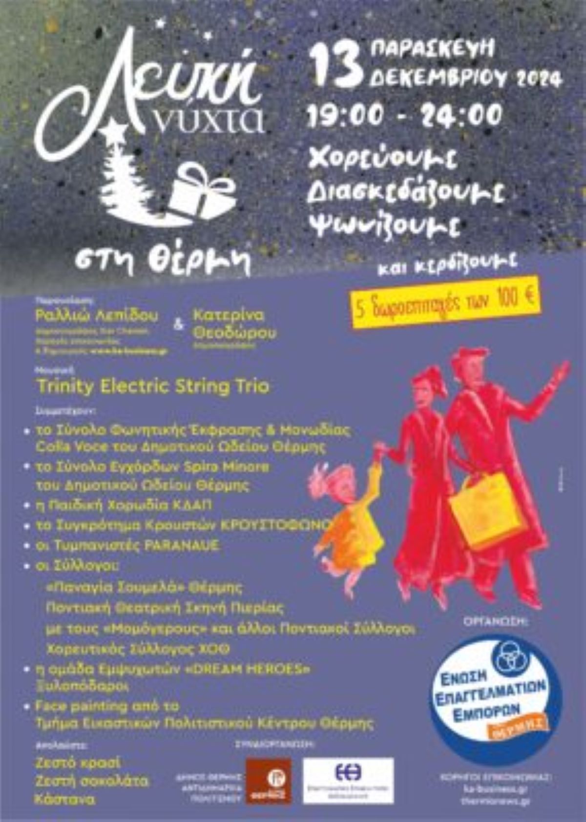 Σήμερα, Παρασκευή 13 Δεκεμβρίου Ν θα πραγματοποιηθεί η Λευκή Νύχτα στη Θέρμη η οποία επρόκειτο να γίνει το Σάββατο 7 του μήνα, αλλά αναβλήθηκε λόγω κακοκαιρίας. Τη Λευκή Νύχτα οποία διοργανώνει εδώ και οκτώ χρόνια η Ένωση Επαγγελματιών Εμπόρων Θέρμης, σε συνεργασία με τον Δήμο Θέρμης και την υποστήριξη του Επαγγελματικού Επιμελητηρίου Θεσσαλονίκης.