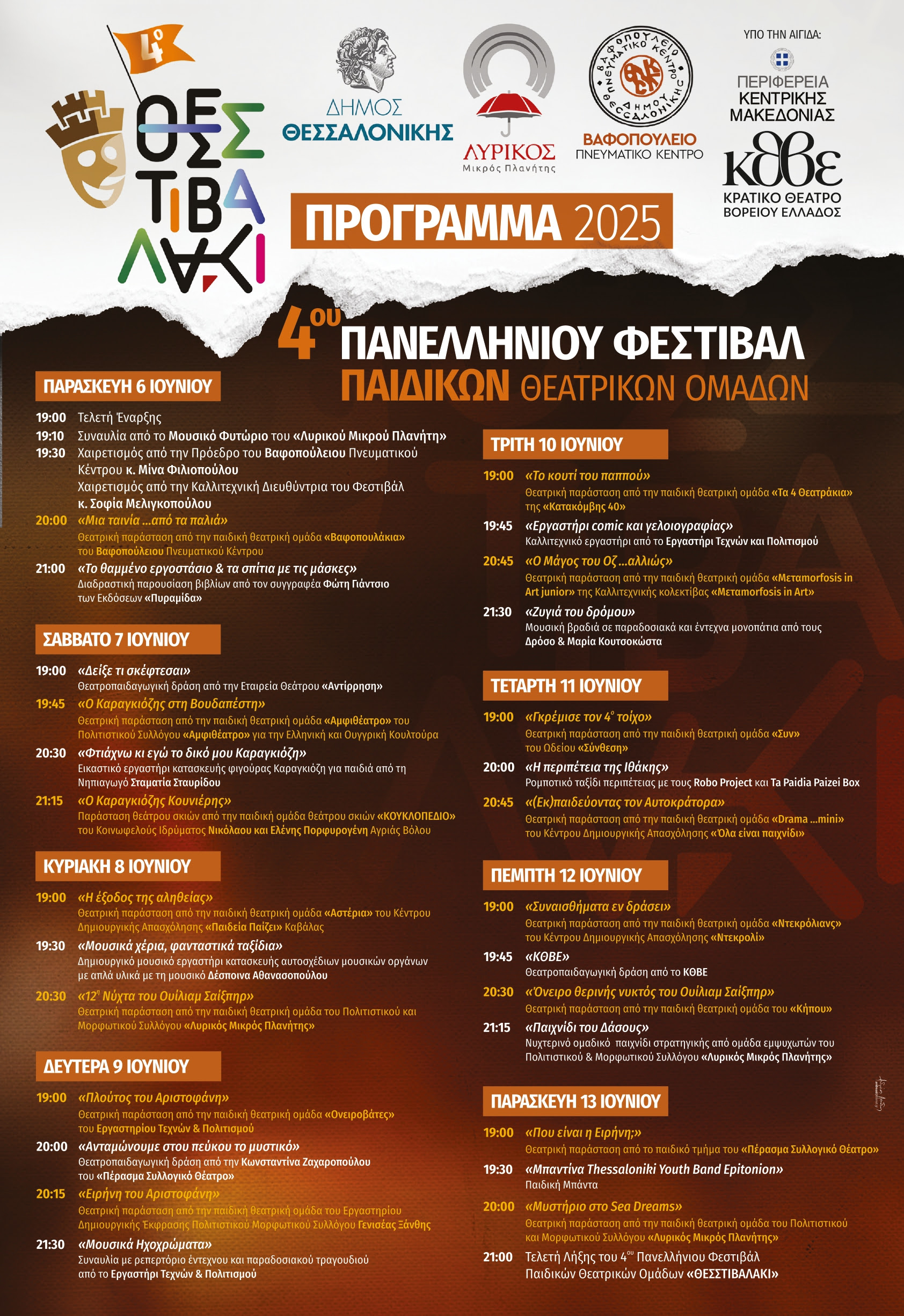 Το 4ο Πανελλήνιο Φεστιβάλ Παιδικών Θεατρικών Ομάδων «ΘΕΣΣΤΙΒΑΛΑΚΙ» διοργανώνει το Βαφοπούλειο Πνευματικό Κέντρο του Δήμου Θεσσαλονίκης και ο Πολιτιστικός και Μορφωτικός Σύλλογος «Λυρικός Μικρός Πλανήτης» από την Παρασκευή 6 έως την Παρασκευή 13 Ιουνίου 2025 στο Πάρκο Νέας Ελβετίας.