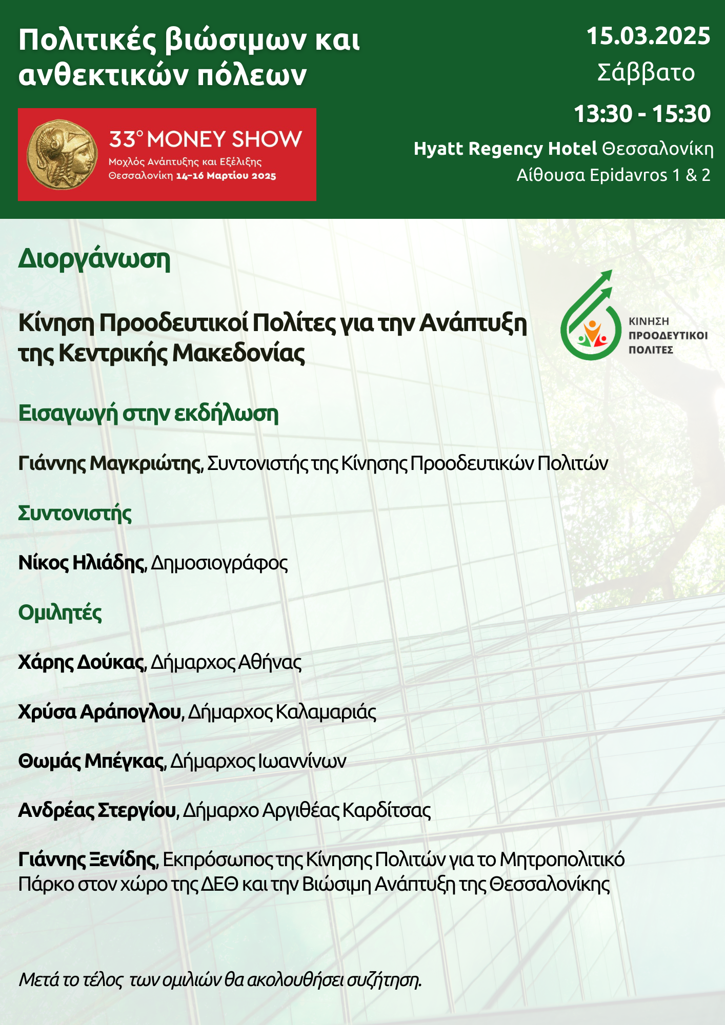 Εκδήλωση με θέμα «Πολιτικές Βιώσιμων και Ανθεκτικών Πόλεων» διοργανώνει η Κίνηση «Προοδευτικοί Πολίτες για την Ανάπτυξη της Κεντρικής Μακεδονίας», το Σάββατο, 15/3, στο πλαίσιο του 33ου Money Show
