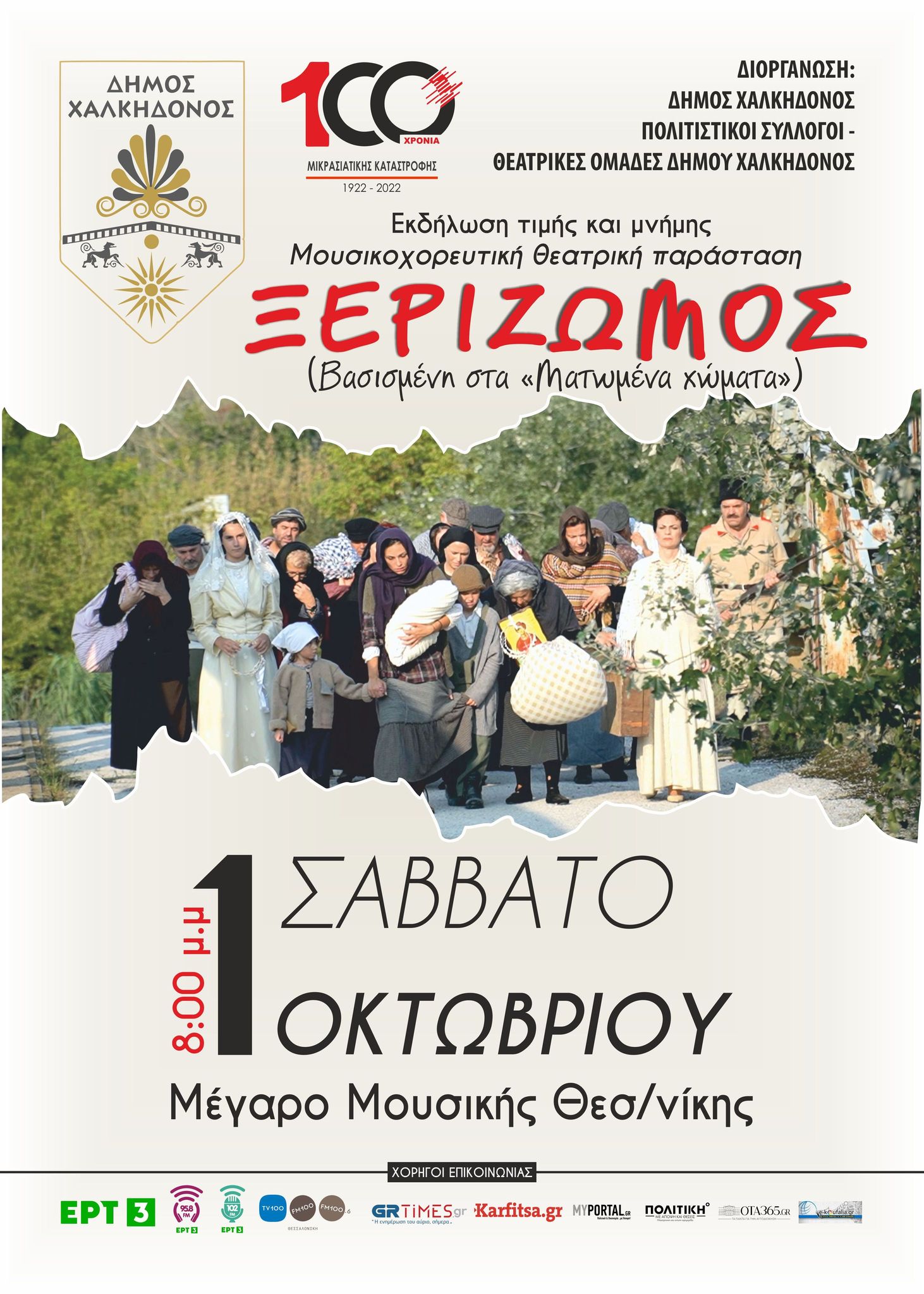 Αύριο στο Μέγαρο Μουσικής Θεσσαλονίκης, ο Δήμος Χαλκηδόνος σε συνεργασία με τους πολιτιστικούς συλλόγους και τις θεατρικές ομάδες του Δήμου παρουσιάζει μια μεγαλειώδης μουσικοχορευτική θεατρική παράσταση με τίτλο «Ξεριζωμός».