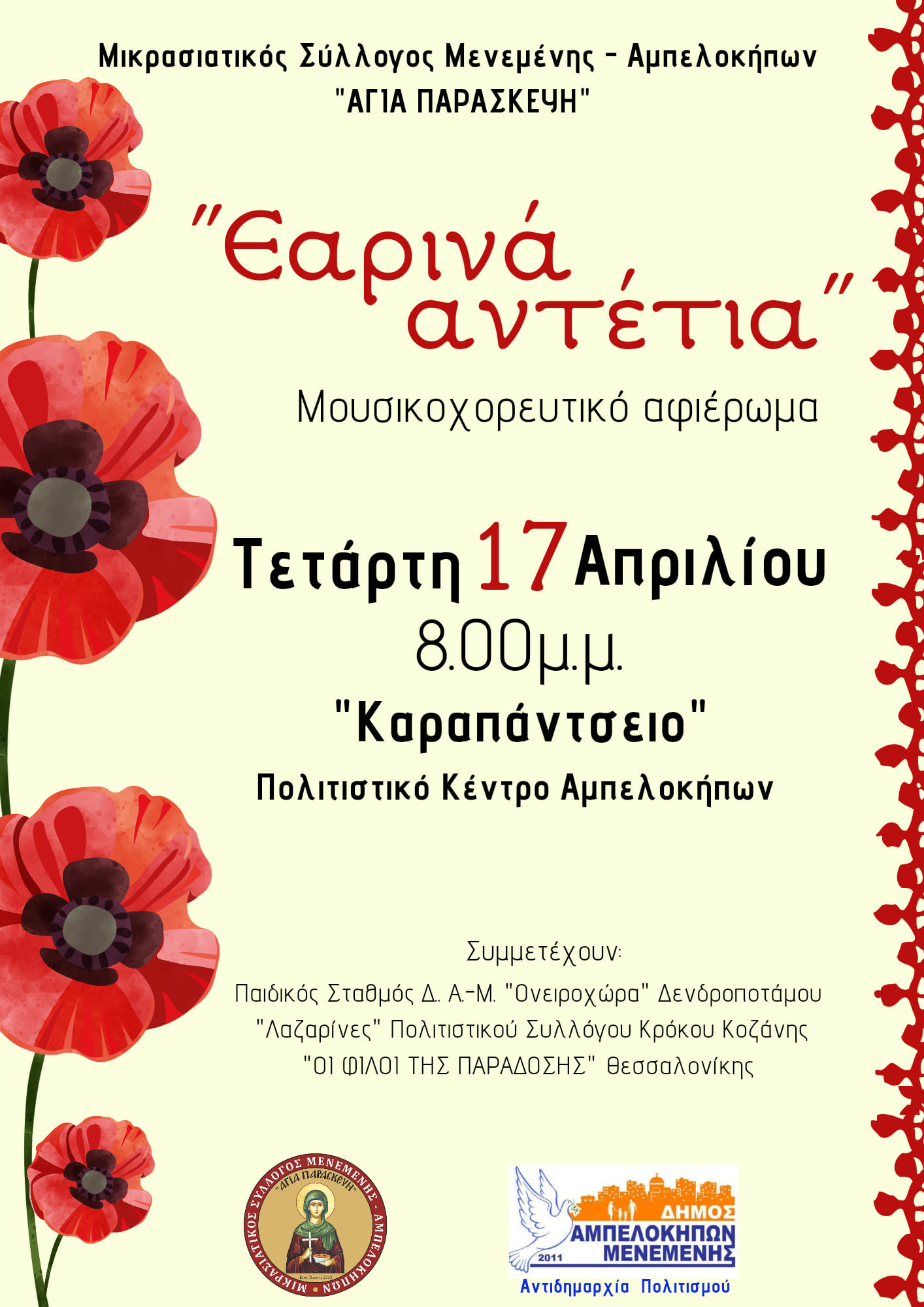 Μουσικοχορευτικό αφιέρωμα με τίτλο «Εαρινά αντέτια» ετοιμάζει ο Μικρασιατικός Σύλλογος Μενεμένης Αμπελοκήπων «Αγία Παρασκευή».