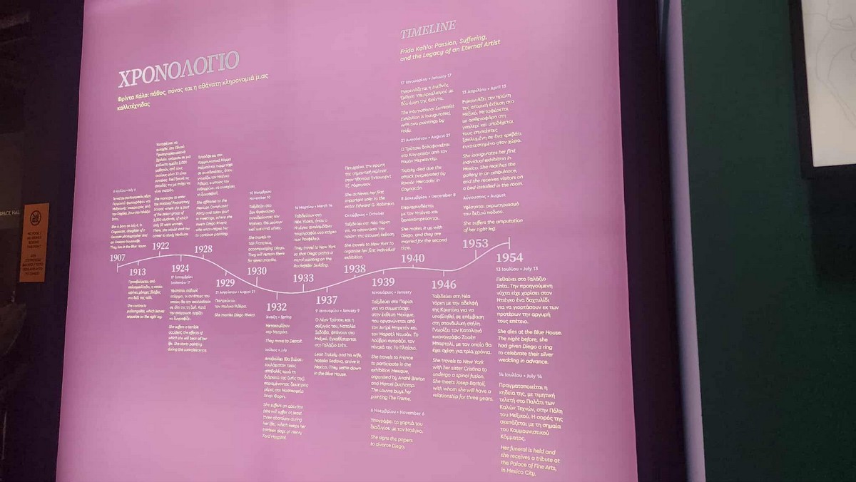 9. ΠΙΝΑΚΕΣ ΠΛΗΡΟΦΟΡΙΩΝ: Κάπου μεταξύ σουρεαλισμού και συμβολισμού, η Φρίντα Κάλο διαμόρφωσε το δικό της εικαστικό ιδίωμα, τόσο μοναδικό όσο και αναγνωρίσιμο —μια τέχνη που ισορροπεί ανάμεσα στη μεγάλη ζωγραφική και το ναΐφ, με αισθητική που είναι ταυτόχρονα λαϊκή και ποπ, καθημερινή και μνημειακή.