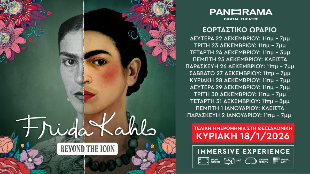 Η immersive ψηφιακή εμπειρία «Frida Kahlo: Beyond the Icon» ολοκληρώνει την παρουσία της στη Θεσσαλονίκη, με τις τελευταίες παραστάσεις να πραγματοποιούνται έως και την Κυριακή 18 Ιανουαρίου 2026 στο PANORAMA Digital Theatre.