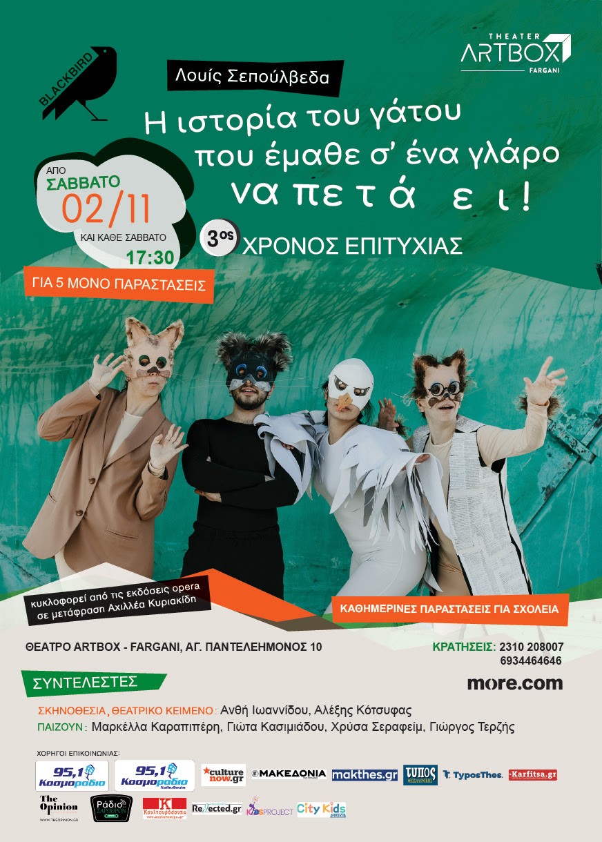 Μετά από συνεχόμενες παραστάσεις σε θέατρα και σχολικές αίθουσες, το παγκοσμίου φήμης αριστούργημα, «Η ιστορία του γάτου που έμαθε σ’ ένα γλάρο να πετάει» του Λουίς Σεπούλβεδα, έρχεται για 3η χρονιά από την ομάδα BLACKBIRD στο θέατρο Artbox Fargani.