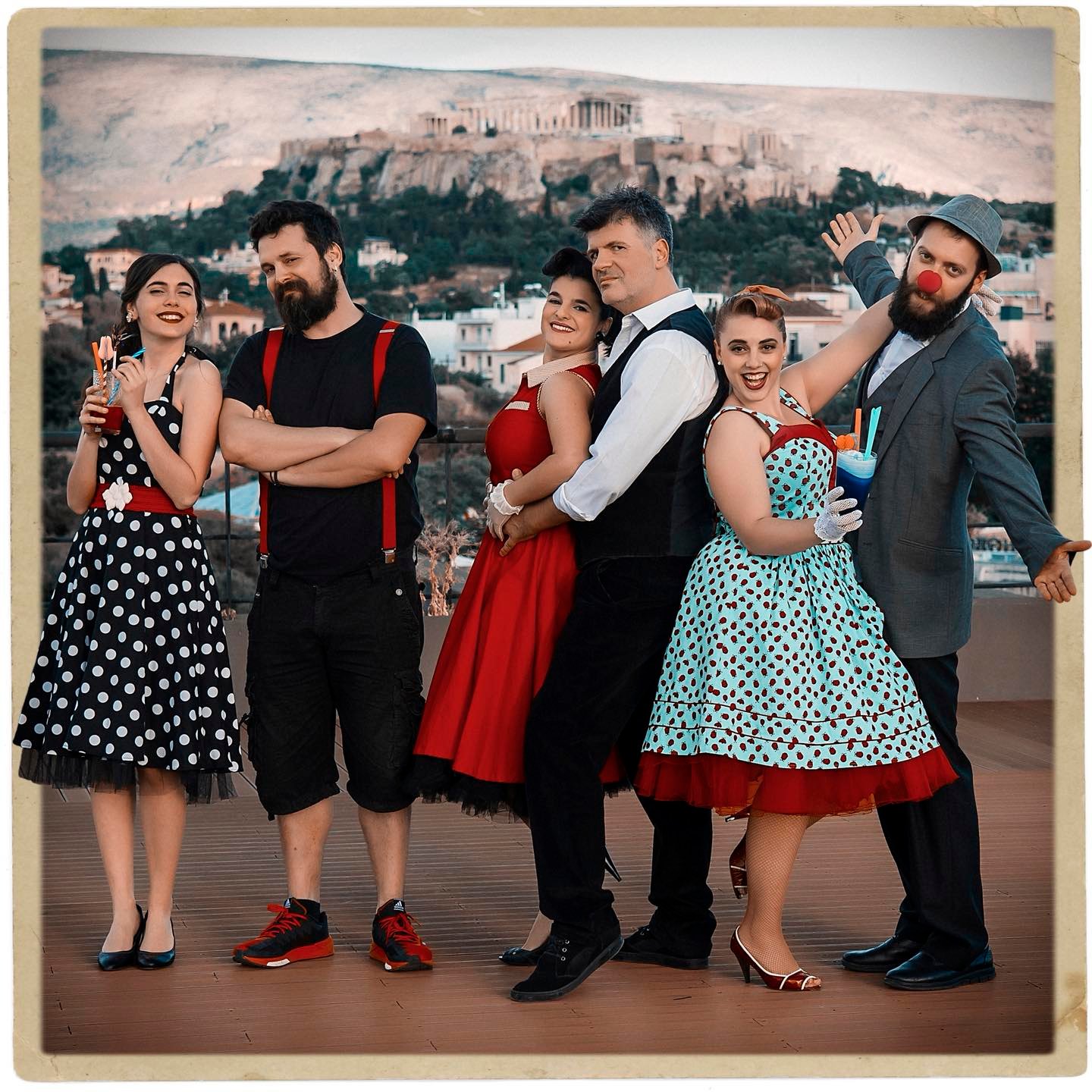 Κάθε χρόνο είχε μαζί του τη θεατρική παρέα του, τους υπέροχους Θανάση Αλευρά, Γαλήνη Χατζηπασχάλη, Πάνο Παπαδόπουλο και Νεφέλη Φασούλη. Μαζί με τον σταθερό θίασο, ανεβαίνουν κάθε φορά στη ρετρό διακοσμημένη σκηνή ξεχωριστοί καλεσμένοι, όπως stand up comedians, ανερχόμενοι τραγουδοποιοί και, κυρίως, σημαντικές προσωπικότητες του ελληνικού πενταγράμμου, προσδίδοντας έτσι μία διάσταση μοναδικής ιστορικής συνάντησης στις γιορτές της ταράτσας.