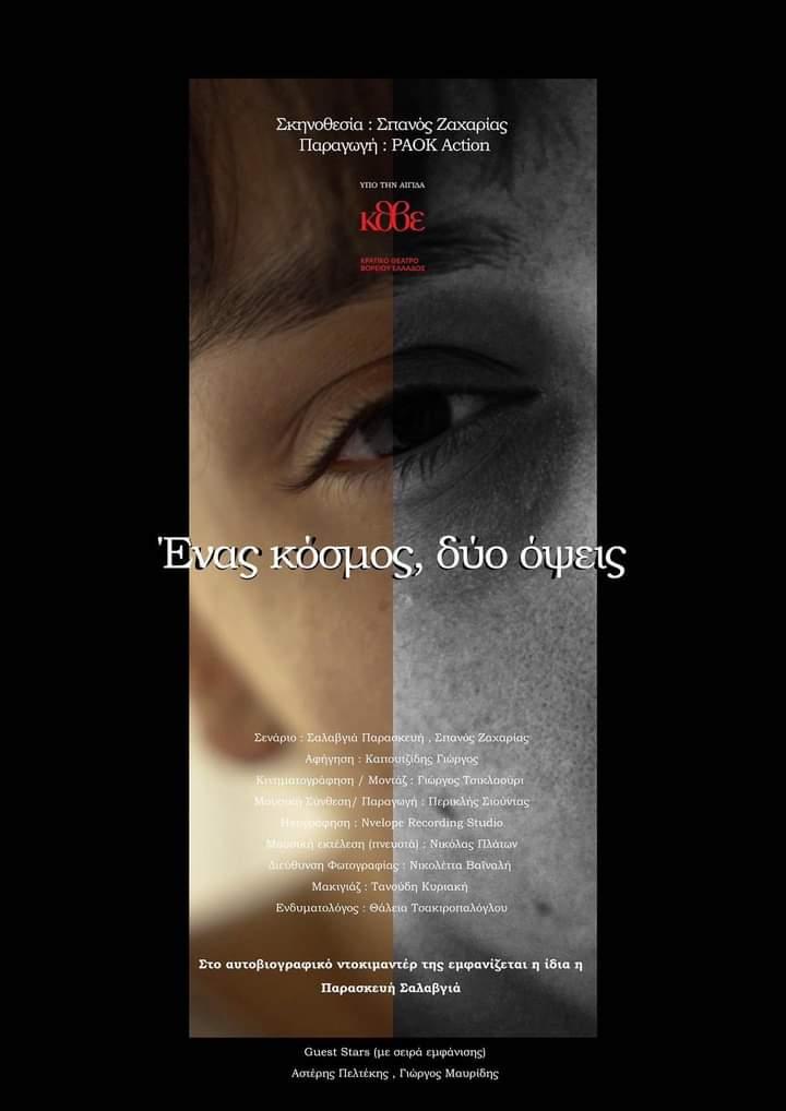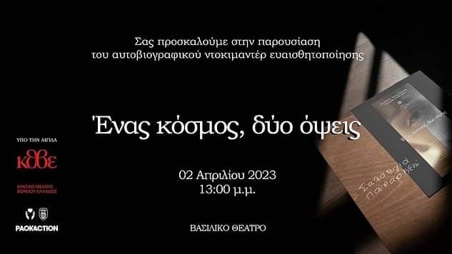 Μετά τη διπλή προβολή στο Φεστιβάλ Ντοκιμαντέρ Θεσσαλονίκης, η μικρού μήκους ταινία «Ένας κόσμος, δύο όψεις» θα επαναπροβληθεί σήμερα Κυριακή, 2 Απριλίου, στο Βασιλικό Θέατρο, με ελεύθερη είσοδο.