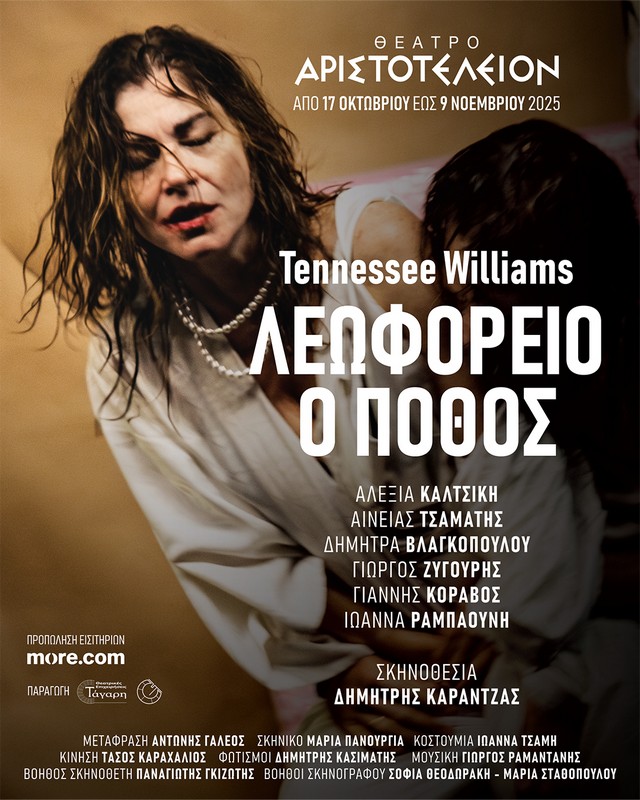 Το θρυλικό έργο του Τενεσί Ούλιαμς, «Λεωφορείο ο Πόθος», ξαναζωντανεύει στη σκηνή του Θεάτρου Αριστοτέλειον από την Παρασκευή 17 Οκτωβρίου, σε σκηνοθεσία Δημήτρη Καραντζά, με την Αλεξία Καλτσίκη στο ρόλο της Μπλανς Ντιμπουά. Τον κόσμο της Μπλανς, συνθέτει μια σπουδαία ομάδα ηθοποιών με τους Αινεία Τσαμάτη, Δήμητρα Βλαγκοπούλου, Γιώργο Ζυγούρη, Γιάννη Κόραβο και Ιωάννα Ραμπαούνη.