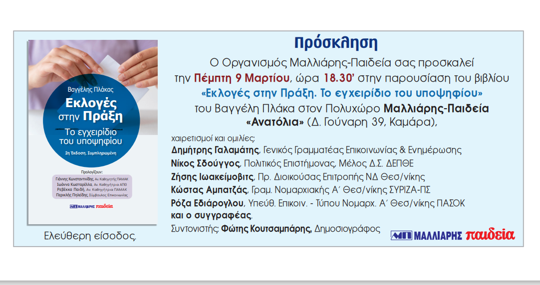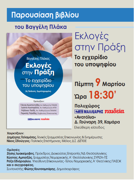 Το νέο βιβλίο του Βαγγέλη Πλακά με τίτλο: “Εκλογές στην Πράξη. Το εγχειρίδιο του υποψηφίου” που μόλις κυκλοφόρησε από τις εκδόσεις Μαλλιάρης-Παιδεία είναι πιο επίκαιρο από ποτέ και θα παρουσιαστεί την Πέμπτη 9 Μαρτίου και ώρα 18:30 στον Πολυχώρο Μαλλιάρης-Παιδεία “Ανατόλια” (Δ. Γούναρη 39, Καμάρα).