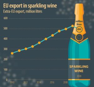 Σύμφωνα με την ευρωπαϊκή στατιστική αρχή που συνέλεξε και επεξεργάστηκε τα στοιχεία, οι εξαγωγές αφρώδους οίνου από χώρες της Ευρωπαϊκής Ένωσης προς τον υπόλοιπο κόσμο, ανήλθαν το 2020 στα 494 εκατομμύρια τόνους.