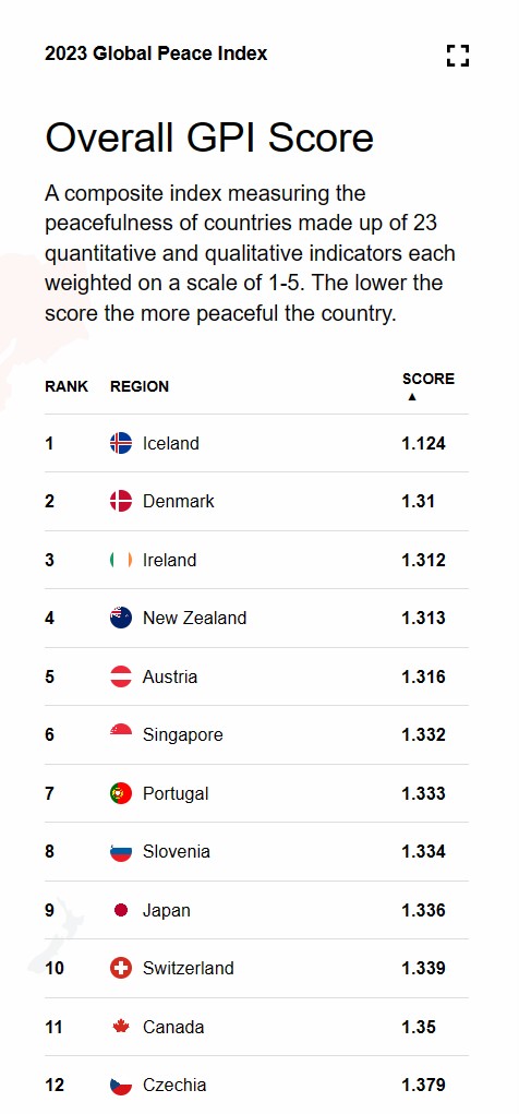 Ακολουθεί ο πλήρης κατάλογος με τις 12 πιο ειρηνικές χώρες στον κόσμο: