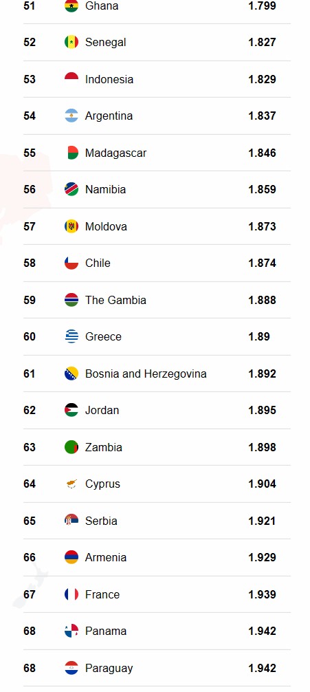 Η Ελλάδα κατέλαβε την 60η θέση, πίσω από τις Γκάνα, Σενεγάλη, Ινδονησία και Γκάμπια.
