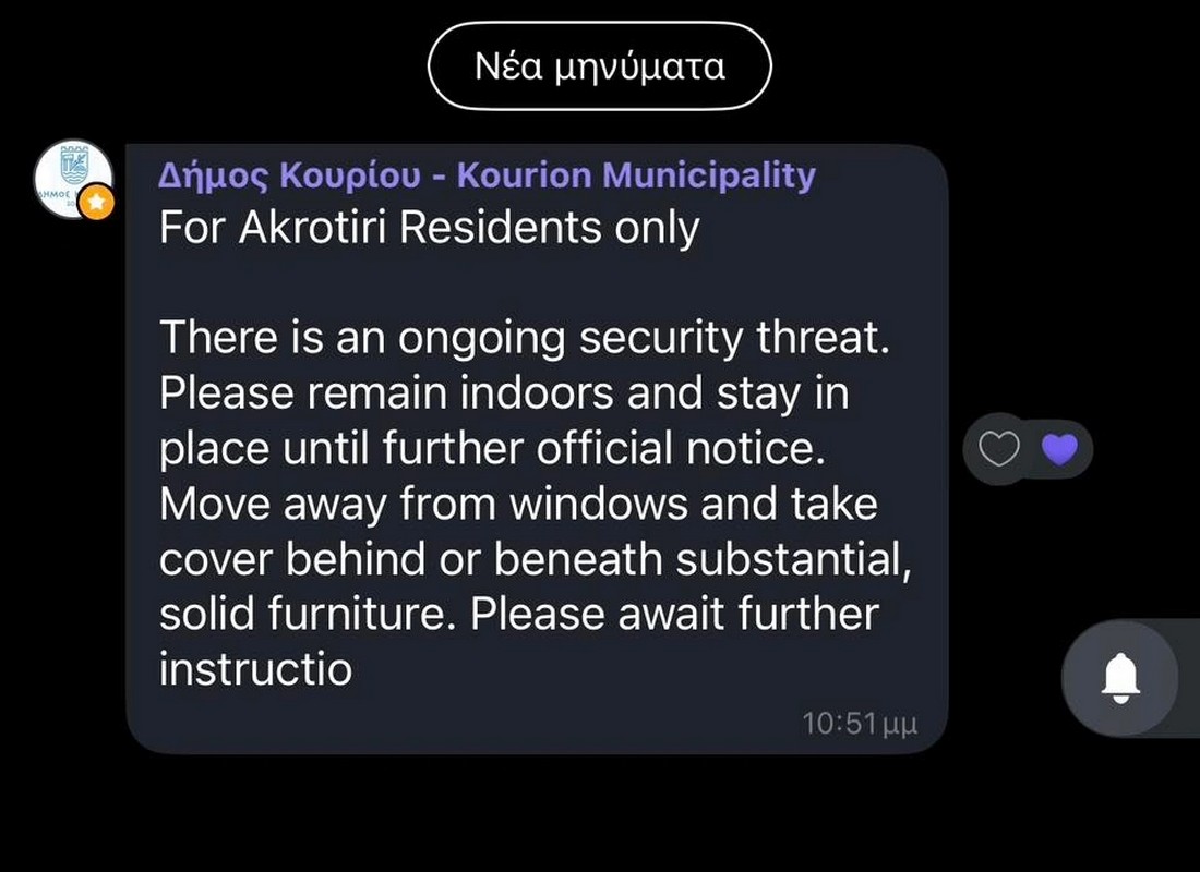 Σειρήνες ήχησαν για άλλη μια φορά στο Ακρωτήρι στην Κύπρο, με τους κάτοικους της περιοχής να έλαβαν μήνυμα για απειλή ασφαλείας, όπως μεταδίδουν κυπριακά ΜΜΕ, κάνοντας λόγο για ύποπτο αντικείμενο τρία περίπου χιλιόμετρα από τη στρατιωτική βάση.
