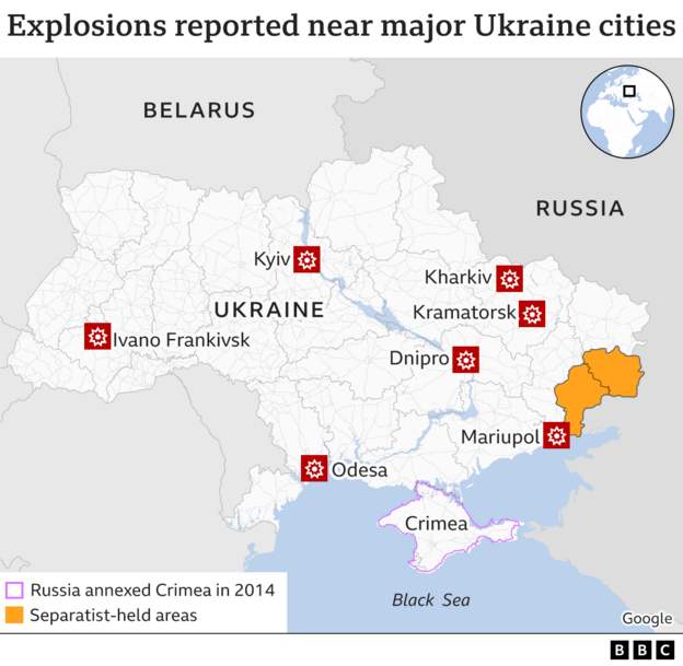 Τα ξημερώματα (ώρα Ελλάδας) ξεκίνησε η ρωσική εισβολή στην Ουκρανία ή «στρατιωτική επιχείρηση» όπως την ονόμασε ο Βλάντιμιρ Πούτιν. Εκρήξεις ακούστηκαν αρχικά σε Κίεβο και Ντονέτσκ και έπειτα σε Μαριούπολη, Χάρκοβο και Οδησσό.