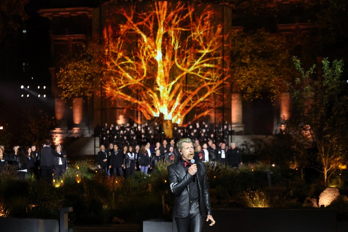 Κατά τη βραδινή τελετή, ο τραγουδιστής του αμερικανικού συγκροτήματος Eagles of Death Metal — που βρισκόταν στη σκηνή του Μπατακλάν τη μοιραία νύχτα τραγούδησε το «You’ll Never Walk Alone», σύμβολο πλέον ενότητας και θάρρους.