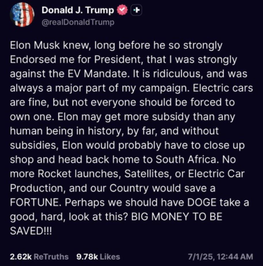 Ο Τραμπ αντέδρασε με μια ανάρτηση στο Truth Social νωρίς την Τρίτη, υποστηρίζοντας ότι ο διευθύνων σύμβουλος της Tesla, Μασκ, ήταν αναστατωμένος με το νομοσχέδιο που καταργεί την εντολή για τα ηλεκτρικά οχήματα (EV) και ότι «ο Έλον θα πρέπει να κλείσει το μαγαζί και να επιστρέψει στη Νότια Αφρική».