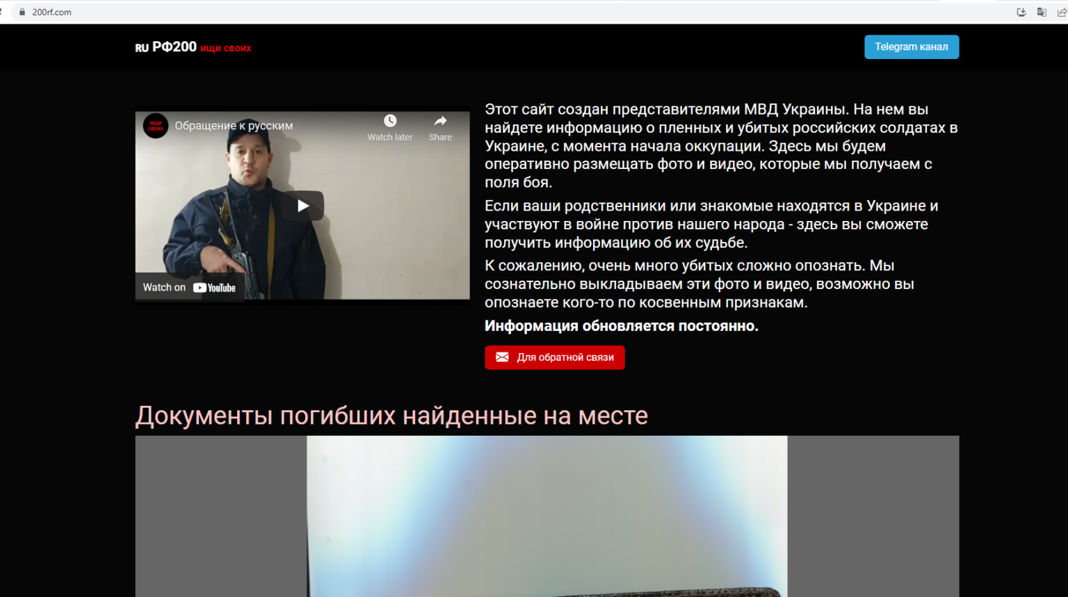 Ο ιστότοπος, 200rf.com, περιέχει φωτογραφίες των εγγράφων και του σώματος των Ρώσων στρατιωτών που η Ουκρανία αναφέρει ότι σκοτώθηκαν από τότε που ο πρόεδρος Βλαντιμίρ Πούτιν ξεκίνησε την επίθεση. Έχει επίσης βίντεο με στρατιώτες που έχουν συλληφθεί.