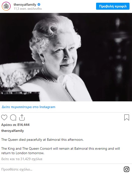 «Η βασίλισσα απεβίωσε εν ειρήνη στο Μπαλμόραλ σήμερα το απόγευμα», αναφέρει η ανακοίνωση των Ανακτόρων.