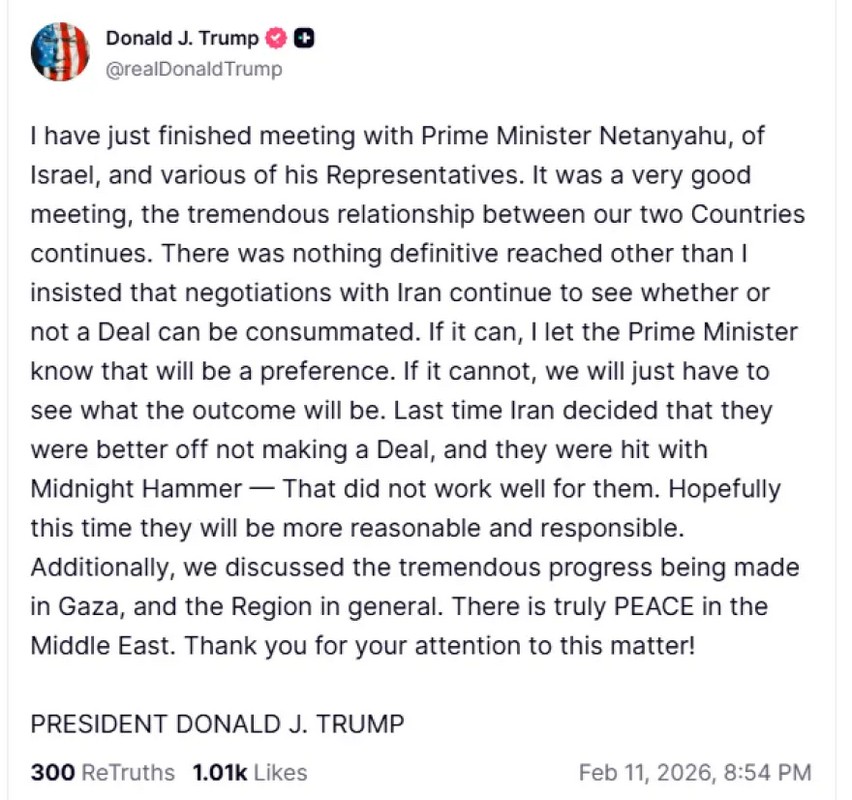 Ακόμη, ο ίδιος γράφει στην ανάρτηση του ότι δεν προέκυψε «τίποτα το οριστικό» από τις συνομιλίες που είχε σήμερα στον Λευκό Οίκο με τον πρωθυπουργό του Ισραήλ Μπενιαμίν Νετανιάχου, πέραν του ότι ο ίδιος «επέμεινε» να συνεχιστούν οι διαπραγματεύσεις με το Ιράν.
