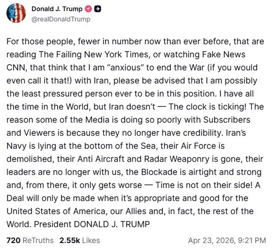 «Προς όλους εκείνους, που λιγοστεύουν συνεχώς, που διαβάζουν την αποτυχημένη (εφημερίδα) New York Times ή παρακολουθούν τα ψέματα του CNN, που πιστεύουν ότι βιάζομαι να βάλω τέλος στον πόλεμο (αν τον αποκαλέσουμε έτσι) με το Ιράν, να ξέρετε ότι είμαι σίγουρα εκείνος που αισθάνεται τη λιγότερη πίεση, απ’ όσους έχουν βρεθεί ποτέ σε αυτή τη θέση. Έχω όλον τον χρόνο του κόσμου, κάτι που δεν ισχύει για το Ιράν», έγραψε ο Ρεπουμπλικάνος πρόεδρος.