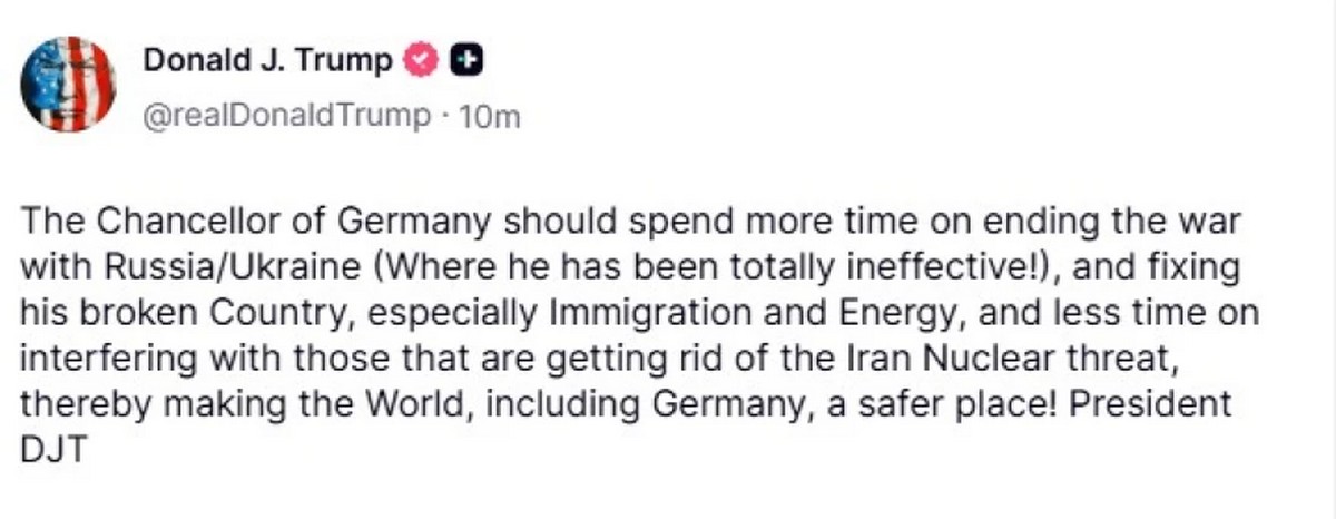 «Ο καγκελάριος της Γερμανίας θα πρέπει να αφιερώνει περισσότερο χρόνο στο να τερματίσει τον πόλεμο Ρωσίας – Ουκρανίας (όπου έχει αποδειχθεί εντελώς αναποτελεσματικός!) και να διορθώσει τη διαλυμένη χώρα του, ειδικά σε θέματα μετανάστευσης και ενέργειας και λιγότερο χρόνο στο να παρεμβαίνει σε όσους εξαλείφουν την πυρηνική απειλή του Ιράν, καθιστώντας έτσι τον κόσμο, συμπεριλαμβανομένης της Γερμανίας, ένα ασφαλέστερο μέρος» τόνισε χαρακτηριστικά ο Αμερικανός πρόεδρος.