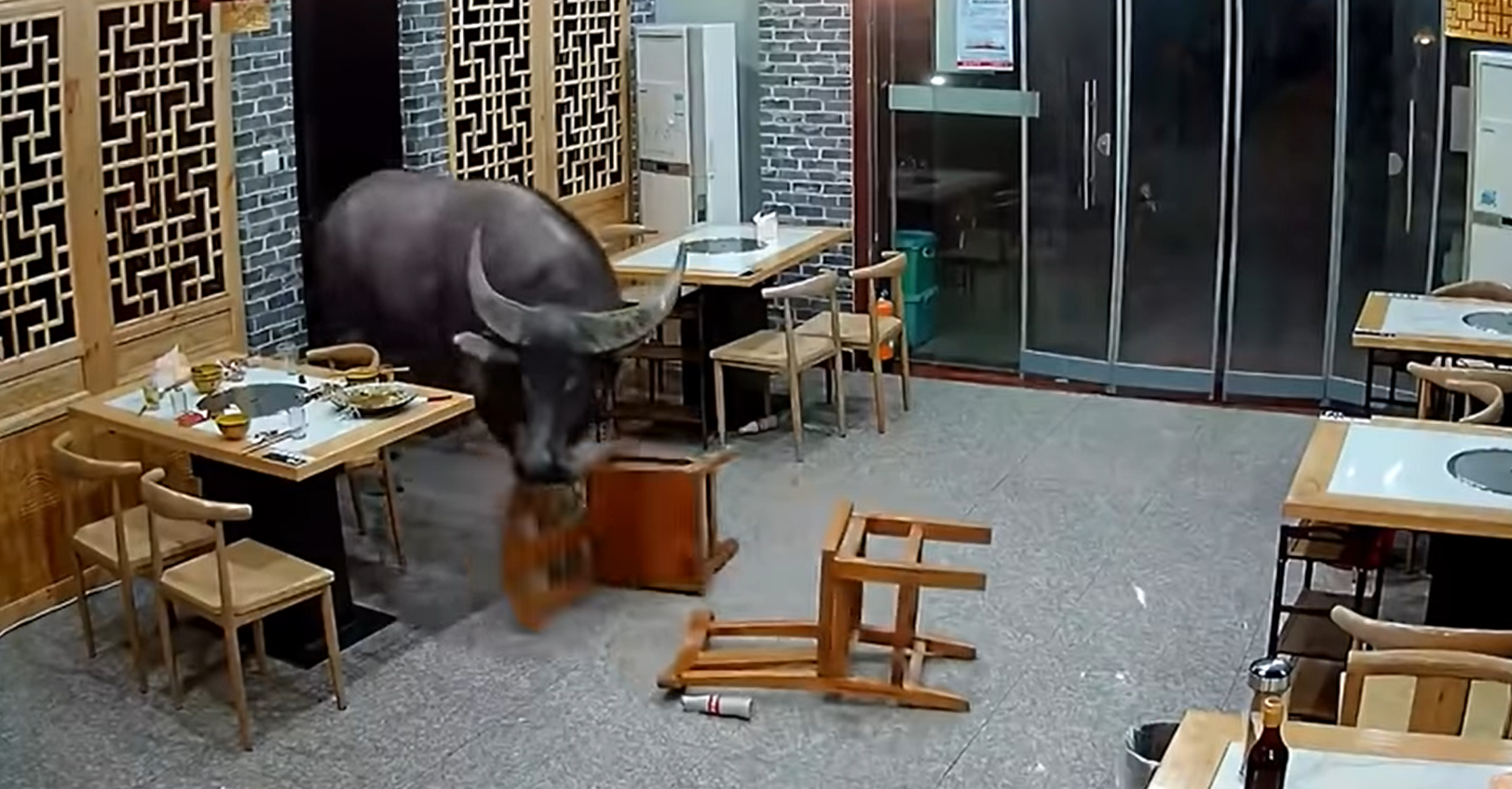 Ένα βουβάλι, εισέβαλε στο εστιατόριο και όντας τρομοκρατημένο, έσπειρε με τις κινήσεις του πανικό. Το βουβάλι έσπασε τα πάντα στο μαγαζί, ενώ τραυμάτισε κι έναν υπάλληλο.