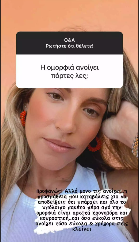 Προφανώς και η ομορφιά ανοίγει πόρτες! Αλλά μόνο τις ανοίγει… η προσπάθεια που καταβάλλεις για να αποδείξεις ότι υπάρχει και όλο το υπόλοιπο πακέτο πέρα από την ομορφιά είναι αρκετά χρονοβόρα και κουραστική… και όσο εύκολα σου τις ανοίγει τόσο εύκολα κα γρήγορα τις κλείνει», τόνισε η ηθοποιός.